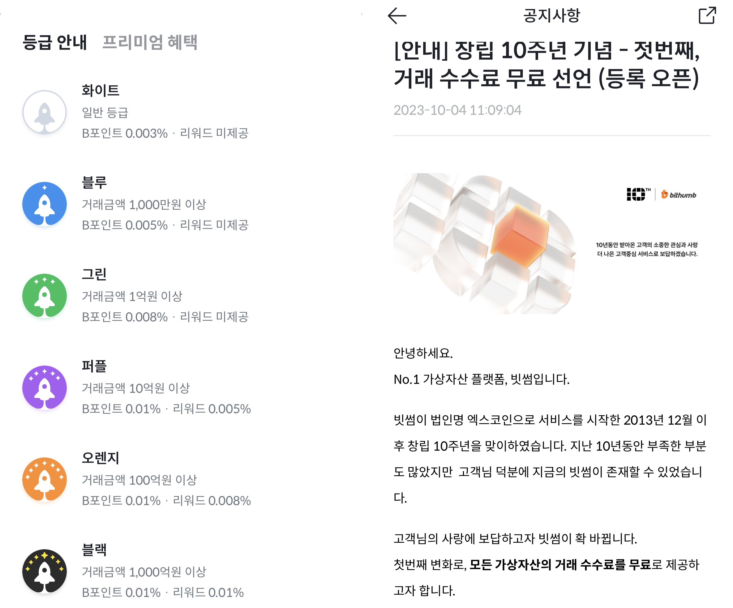 10주년 기념 거래수수료 무료 행사 중이며 멤버십 도입으로 리워드가 제공되고 있습니다.