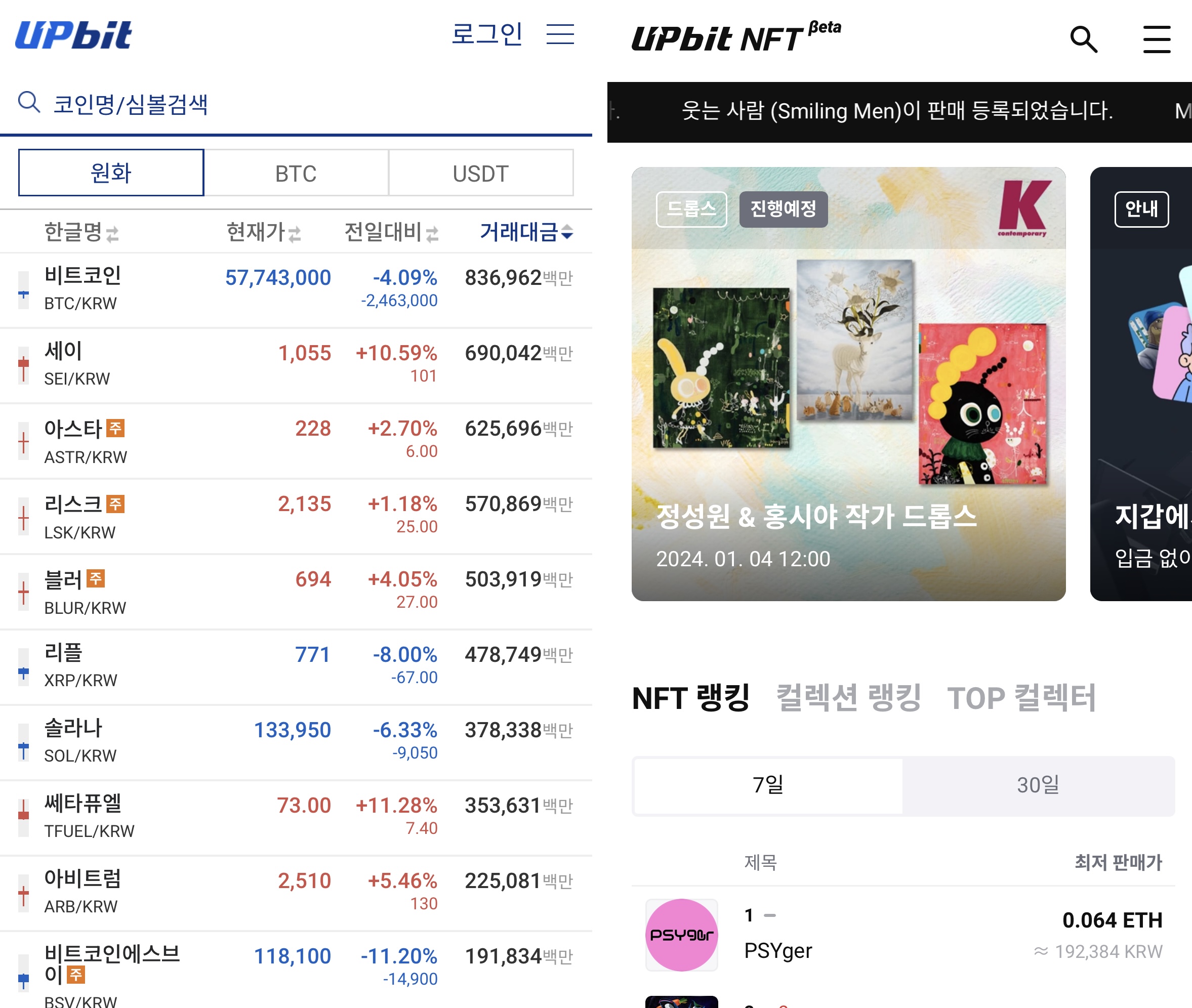 업비트는 가상화폐 거래뿐 아니라 NFT거래소(현재 beta)도 운영하고 있습니다.