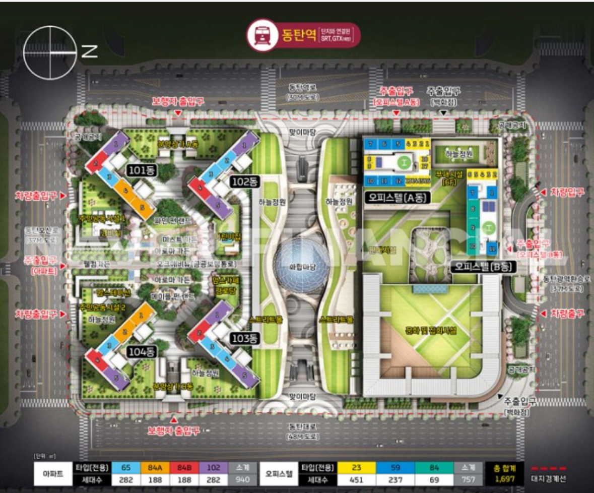 동탄역 롯데캐슬은 총 940세대이며 2021년 7월 입주한 아파트입니다. 이 중 무순위 1세대(101동 4404호)와 계약취소 주택 4세대(101동 303호, 104동 3701호, 102동 4905호, 104동 405호) 가 이번 청약 대상입니다. 청약 대상 동의 단지 배치도는 아래의 배치도를 참고해보시면 됩니다.