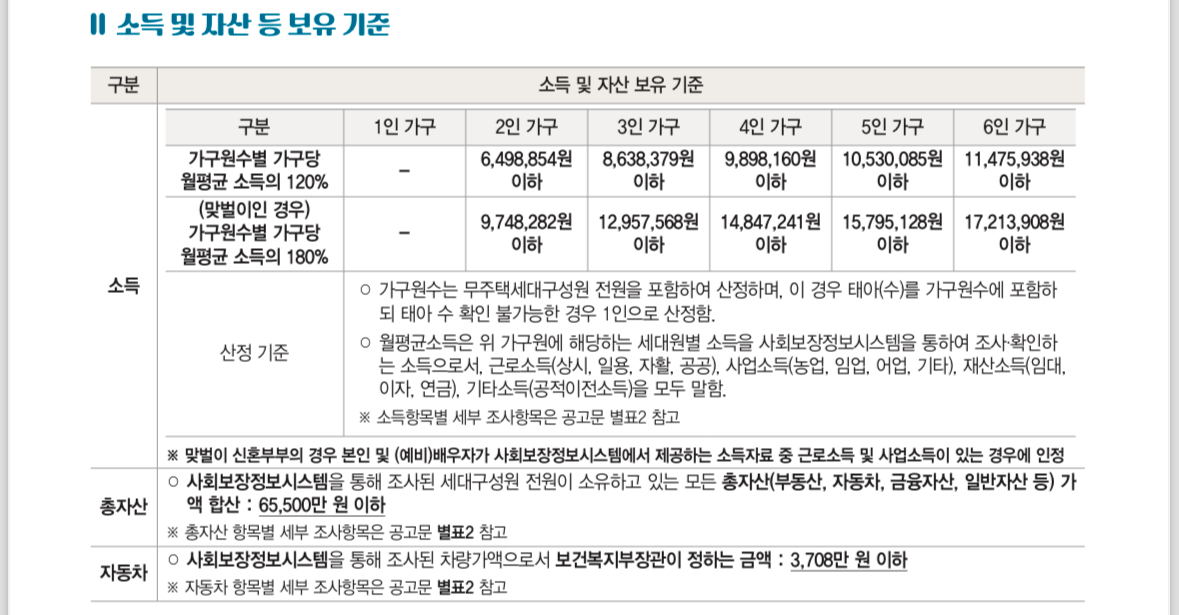 가구당 월평균소득의 120% 이하(맞벌이 (예비) 신혼부부의 경우 180% 이하)인 가구가 신청가능합니다. - 해당 무주택세대구성원이 보유하고 있는 총 자산 가액 합산액이 65,500만 원 이하이고, 자동차가액이 3,708만 원 이하인 가구가 해당됩니다.