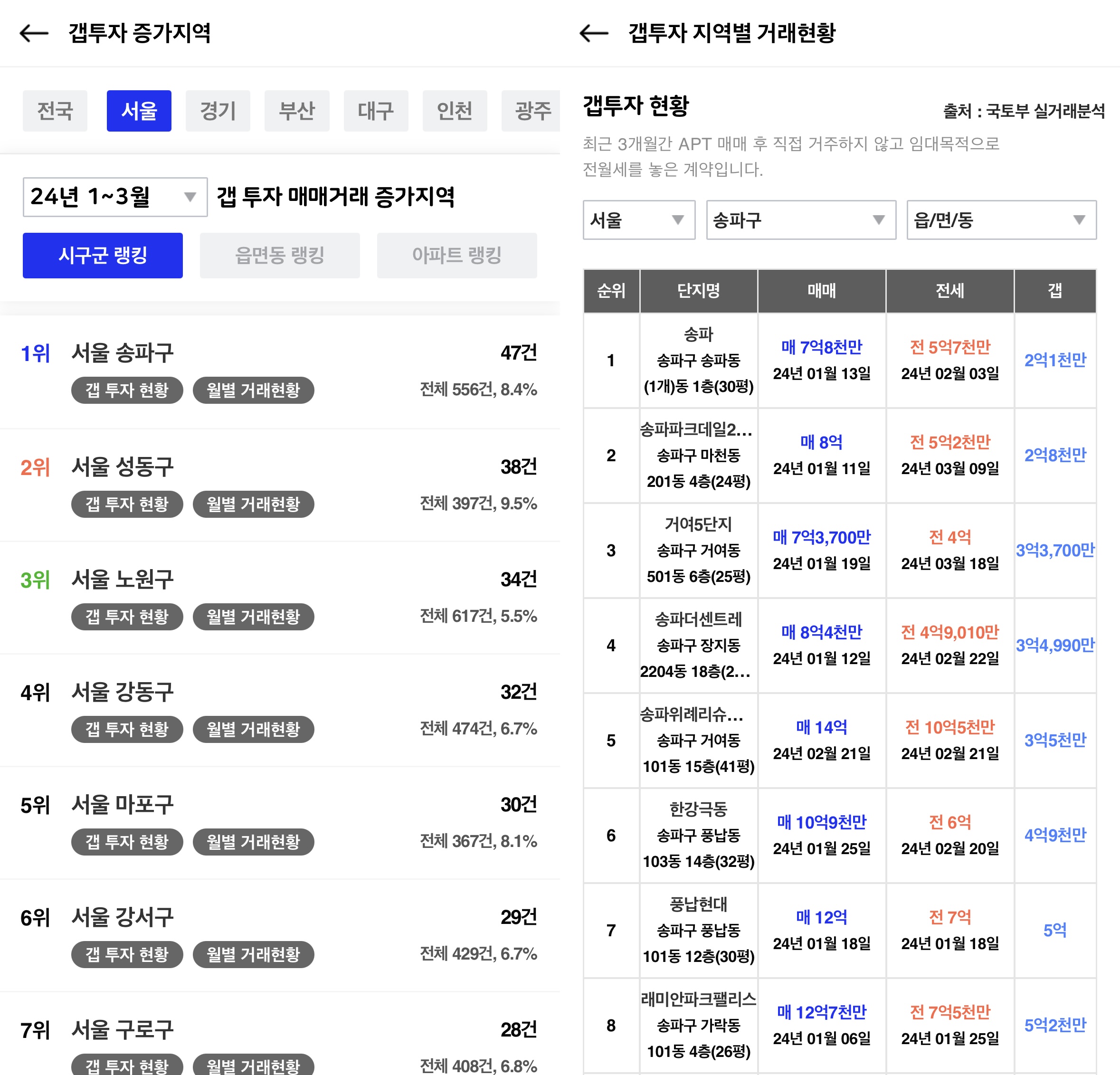 메인 페이지의 갭투자를 클릭해 보면 지역별, 아파트 별 갭투자 현황을 쉽게 볼 수 있습니다. (글 쓰는 2024년 10월 기준에서 2024년 1월~3월까지의 데이터가 최신이라는 것은 감안하고 보셔야 할 것 같습니다.)