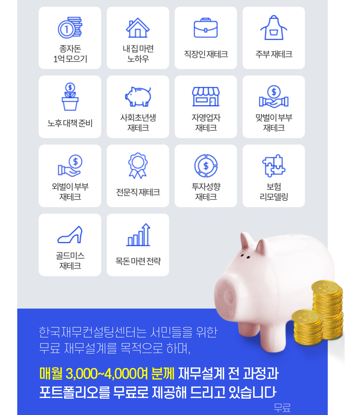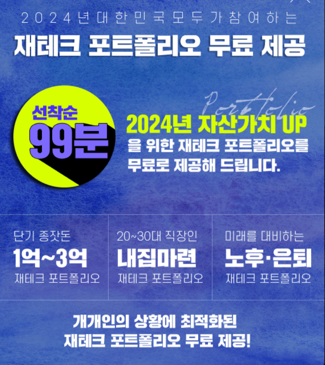무료 재테크 포트폴리오를 제공하고 있으니 지금 바로 아래의 버튼을 클릭해 온라인 예약을 시도해 보시기 바랍니다.