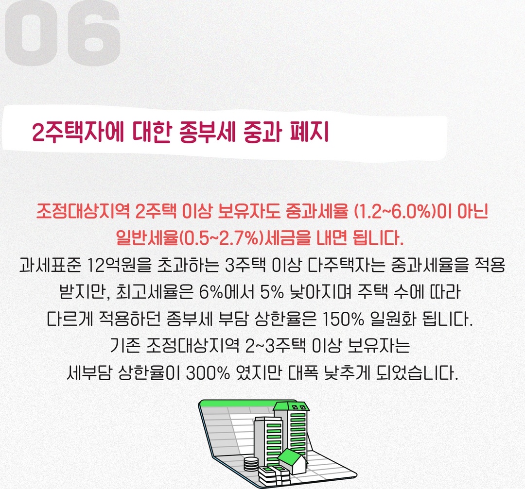 세금과 관련된 분야에서는 부동산 취득세 과세 기준 변경, 양도소득세 이월 과세 기간 확대, 2 주택자 종합부동산세 중과 배제 등의 시행될 예정입니다.
