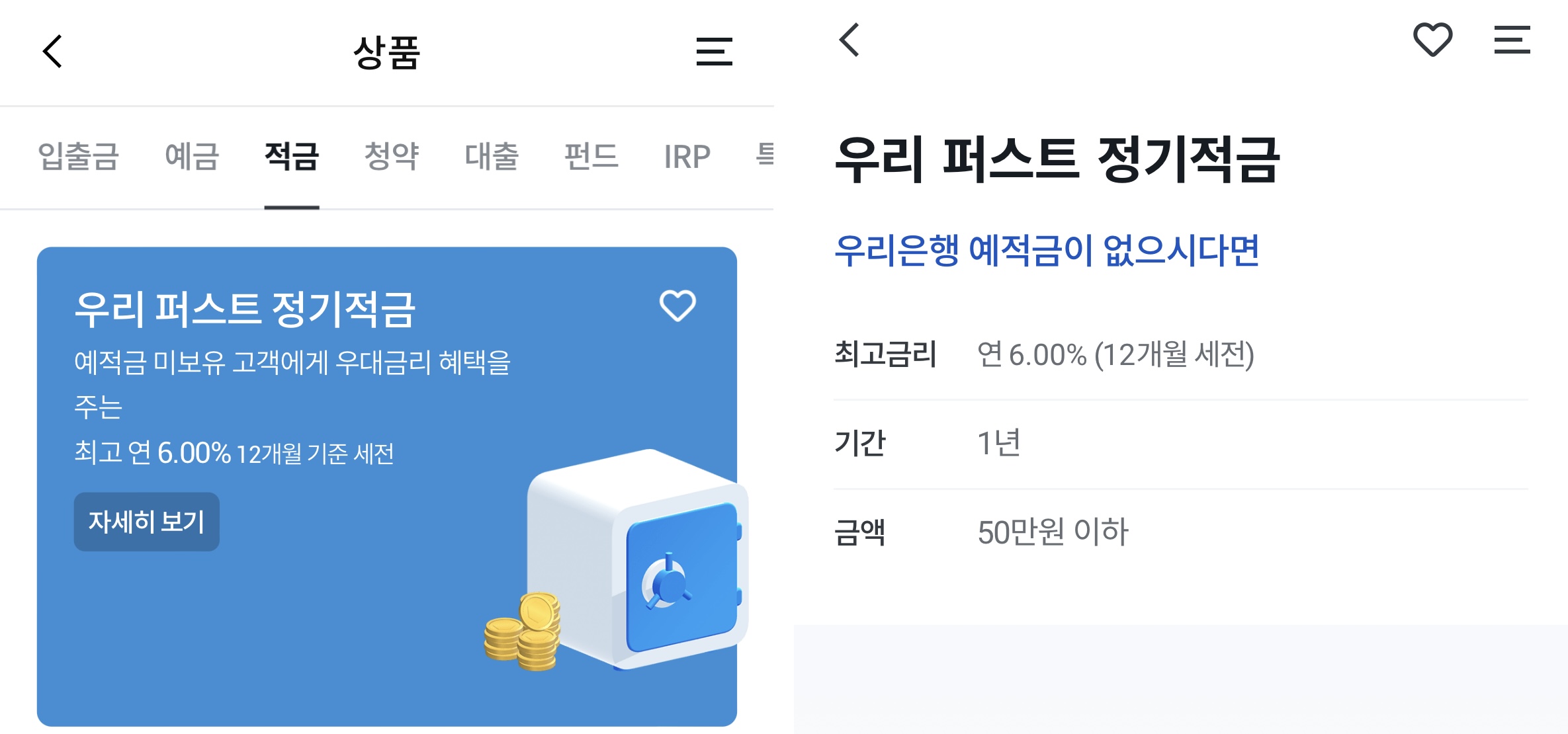 이 상품은 모바일 전용 상품으로, 기본금리 4.0%에 우대금리 3.0%가 더 적용되어 최고 연 7.0%의 적금금리를 지원합니다. 가입대상은 신청일 기준으로 1년 이내 우리은행에서 정기 예,적금 상품에 가입한 적이 없어야 합니다. 만기는 1년으로 월 최대 50만 원까지 납입이 가능합니다. 판매 한도는 70만 좌이며, 한도가 소진되면 판매 종료됩니다.