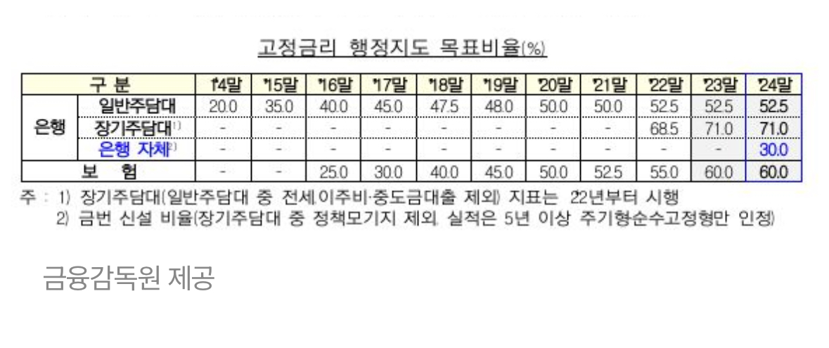 - 은행 자체 고정금리 주택담보대출 목표비율 신설: 금융감독원은 은행들이 자체적으로 제공하는 고정금리 주택담보대출의 목표비율을 30%로 설정하였습니다.