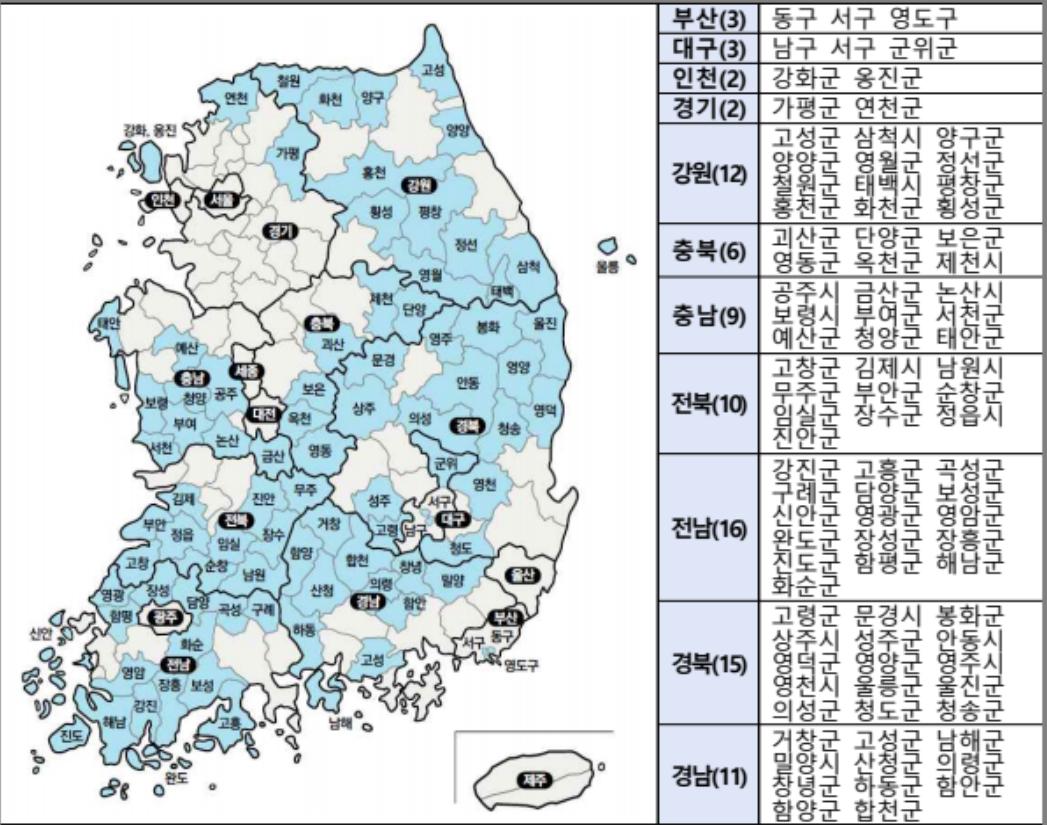 이들 지역은 주로 인구 감소가 심각한 곳으로, 세컨드홈 정책을 통해 생활 인구 유입을 촉진하고 지역 경제를 활성화하려는 목적이 있습니다.