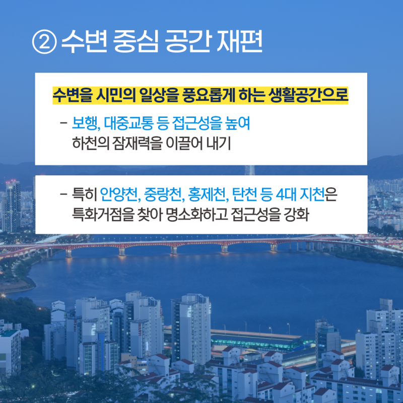 61개 하천 활용: 서울 전역의 하천과 수변의 잠재력을 활용하여 시민생활의 중심으로 만드는 도시공간 재편을 추진합니다.
