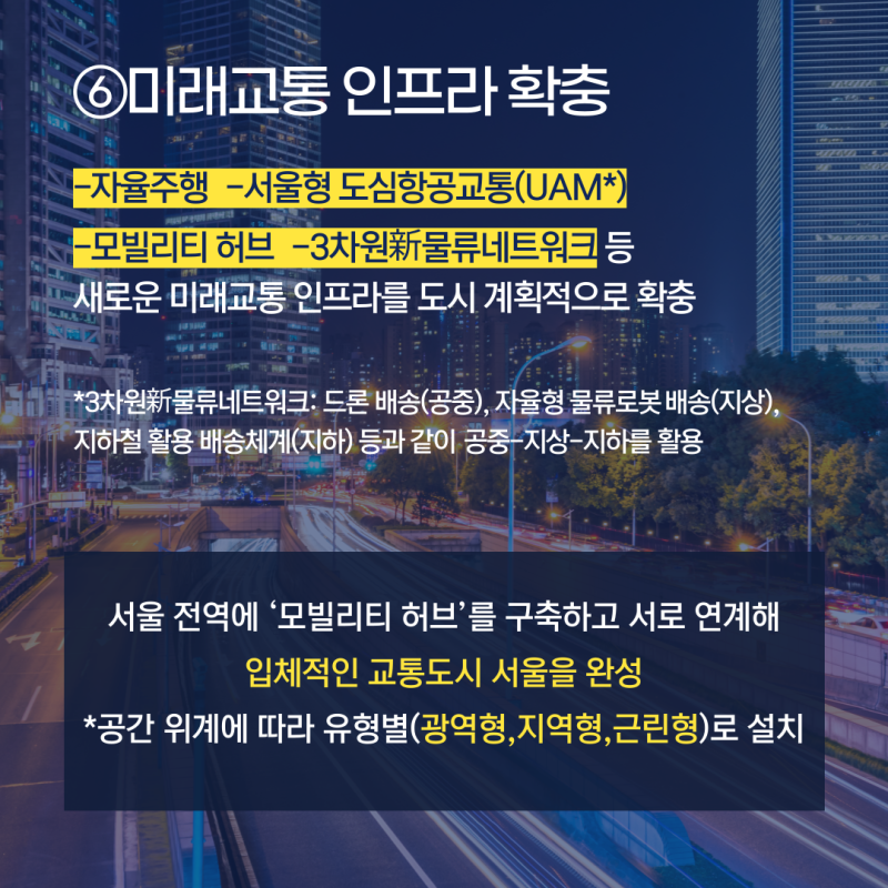 자율주행 및 UAM: 자율주행, 서울형 도심항공교통(UAM), 모빌리티 허브, 3차원 신물류네트워크 등 미래교통 인프라를 확충합니다.