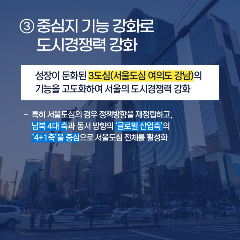 3도심 기능 고도화: 서울도심, 여의도, 강남을 중심으로 기능을 고도화하여 서울의 글로벌 도시경쟁력을 강화합니다.