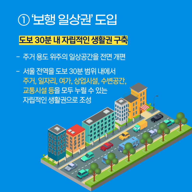 도보 30분 자립생활권: 주거용도 위주의 일상공간을 전면 개편하여, 도보 30분 이내에서 일자리, 여가문화, 수변녹지, 상업시설, 대중교통거점 등 다양한 기능을 복합적으로 누리는 자립적인 생활권으로 업그레이드합니다.