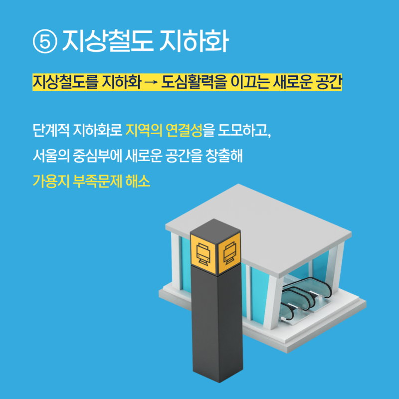 지상철도 단계적 지하화: 도시공간 단절과 소음 진동 문제를 해결하고, 새로운 활력공간을 창출하기 위해 지상철도를 단계적으로 지하화합니다.