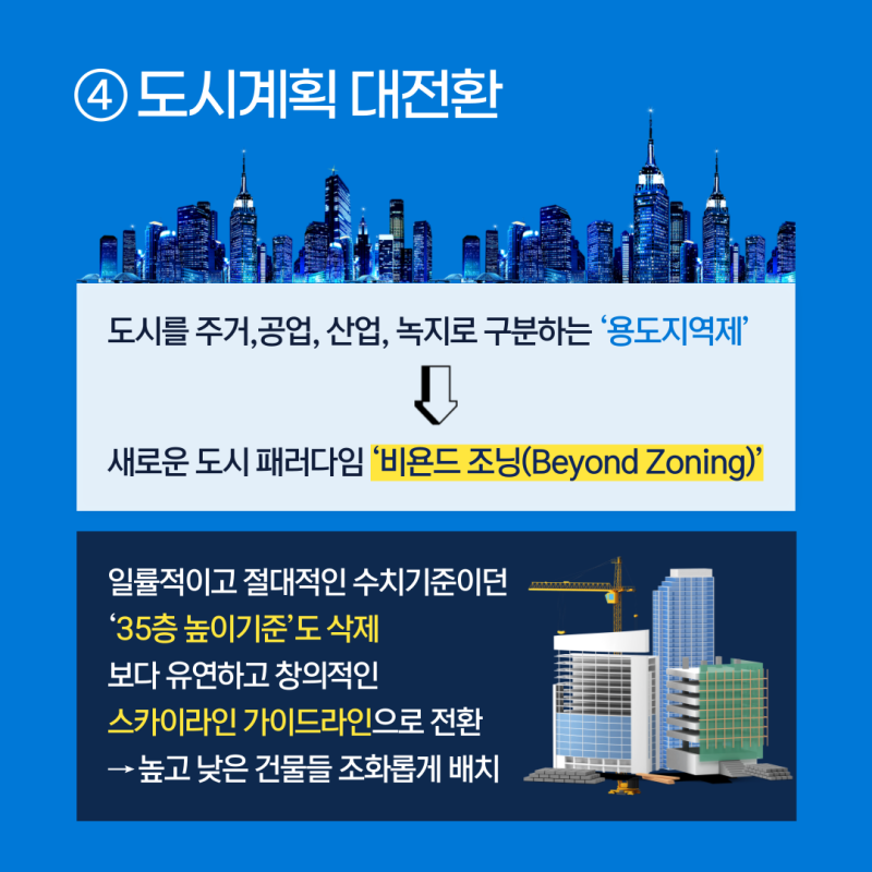 용도지역제 개편: 기존의 용도지역제와 스카이라인 관리기준을 대대적으로 개편하여, 다양한 도시의 모습을 담아내는 도시계획의 대전환을 추진합니다.